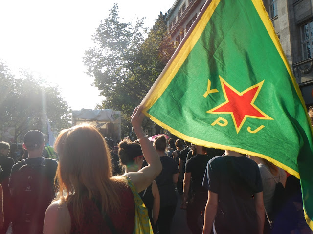 Der Westen, insbesondere die EU, die NATO und das US-geführte Anti-IS-Bündnis "Operation Inherent Resolve" (OIR), sollten sich langsam mal entscheiden, wen sie in diesem Krieg eigentlich unterstützen, nachdem Tausende ihr Leben für den Kampf auch um unsere Freiheit verloren haben. Unter diesen sind übrigens nicht nur Kurd*innen und andere freiheitsliebende Menschen aus Syrien, sondern auch Freiwillige aus aller Welt, darunter mittlerweile auch schon drei gefallene Internationalist*innen aus Deutschland. Das Trauerspiel der westlichen Türkei- und Syrien-Politik ist wahrlich zum Fremdschämen. Auch dagegen wollte ich mit meiner YPJ-Fahne ein Zeichen der Solidarität mit den tapferen und leidgeprüften Menschen in Rojava setzen, die dort trotz alledem ein "demokratisches, friedliches Miteinander aller Nationalitäten, Religionen und Geschlechter" aufbauen, in einem alternativen Gesellschaftsmodell, dessen "Freiheitsrechte, basisdemokratische Selbstverwaltung und Selbstbestimmung" einzigartig in der kriegsgeplagten Region sind und "den einzigen erfolgversprechenden Lösungsansatz für eine nachhaltige Befriedung des Nahen Ostens" darstellen (Zitate aus dem gemeinsamen Aufruf von NAV-DEM / HDK / IL). Ich bitte in diesem Zusammenhang und mit Blick auf das Photo oben rechts auch um Beachtung der Tatsache, dass in der autonomen Region Rojava Frauen selbst entscheiden können, ob sie zum Beispiel ein Kopftuch tragen und gleichberechtigter Teil der politischen, wirtschaftlichen, gesellschaftlichen und auch militärischen Entscheidungen sind, während wir in der Türkei und teilweise auch in Europa (etwa das reaktionäre Frauenbild der AfD) einen anti-emanzipativen, anti-feministischen Backlash erleben...